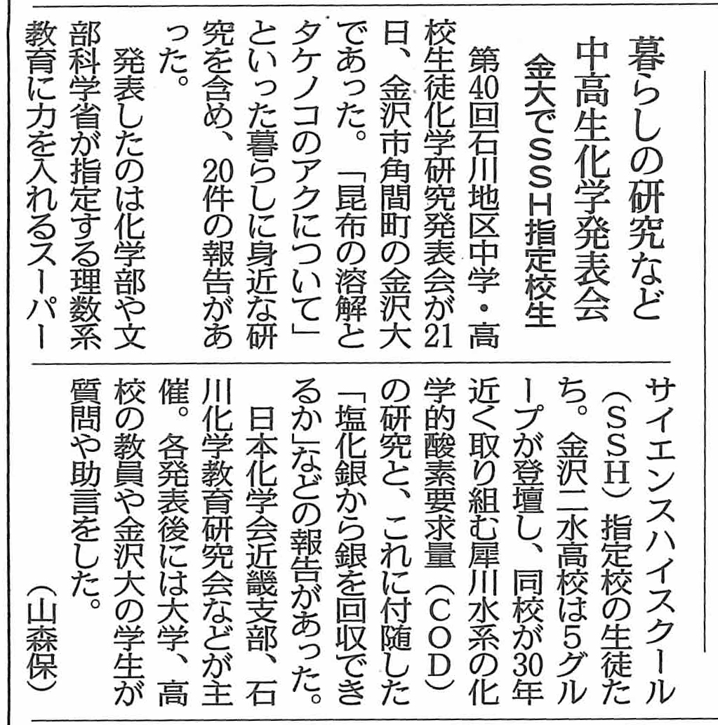 12月21日(日),日本化学会近畿支部と石川県高等学校文化連盟,石川化学教育研究会の共催により,第40回石川地区中学高校生徒化学研究発表会が開催されました.